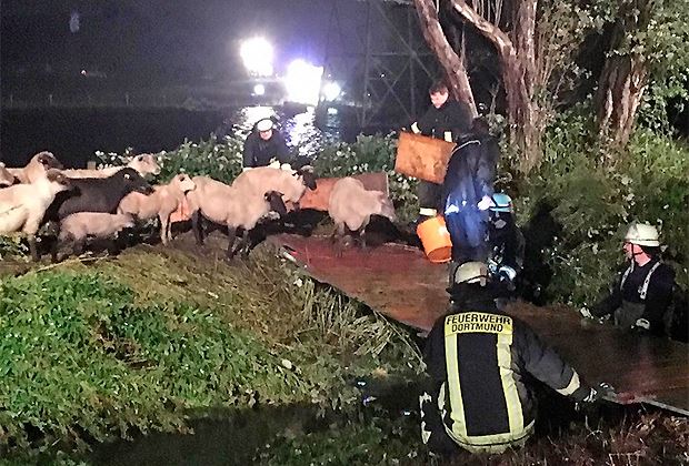 Insgesamt kamen rund 120 Feuerwehrkräfte zum Einsatz, um die Schafe von der sieben Hektar grossen Weidefläche im Dortmunder Ortsteil Persebeck zu retten.