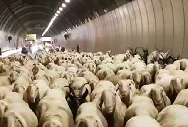 Normalerweise herrscht im Tunnel Tempo 80. Doch für einmal wurde Schritttempo eingeführt. Denn am Montagmorgen um 4.30 Uhr passierten mehrere hundert Schafe sowie Esel, Hunde und Ziegen den Tunnel. Die Schafe und Esel verhielten sich in der für sie ungewohnten Gegend sehr ruhig.