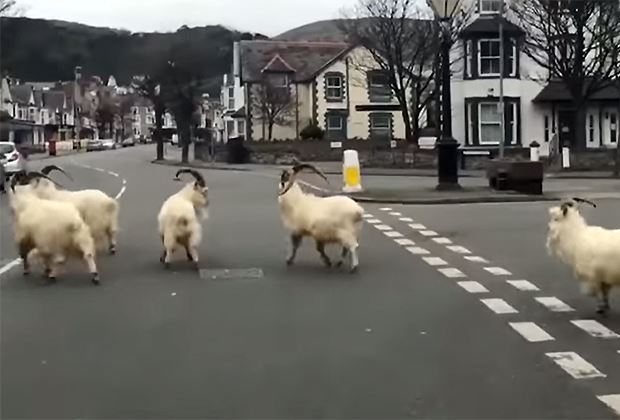 Eine Herde wilder Kaschmir-Ziegen hat während der Corona-Pandemie die fast menschleeren Strassen des britischen Seebads Llandudno erobert. Die Tiere kamen von einem kleinen Berg im Norden von Wales herunter und tummeln sich seitdem in dem Ort an der Irischen See. -> Mit Video