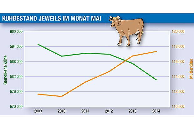 Im Mai 2009 verzeichnete die TVD 594'917 Milchkühe. 2014 waren es im gleichen Monat noch 580'709 laktierende Tiere. Dies entspricht einer Reduktion von 1,2 Prozent. In der gleichen Zeitspanne nahm die Anzahl Mutterkühe um 6387 Tiere zu. In den letzten fünf Jahren hat der Bestand somit von 110'826 (+5,8%) auf 117'213 Tiere zugenommen.