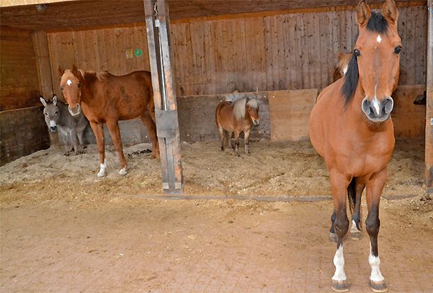 Strickler kann sich über mangelnde Nachfrage nicht beklagen. Seine Pensionsplätze sind alle besetzt. Dazu trägt neben dem recht günstigen Preis von 500 Franken pro Monat sicher auch die äusserst angenehme Stimmung im Stall bei. Wohlgemerkt: die Stimmung unter den Pferden. Trotz Grossgruppe sind keine Rangeleien im Gang. Die Tiere, vom Shetlandpony über den Esel bis zum Grosspferd, stehen einzeln oder in Gruppen und warten auf frisches Futter. Die ganz hungrigen tun sich an der Raufe am frischen Stroh gütlich.