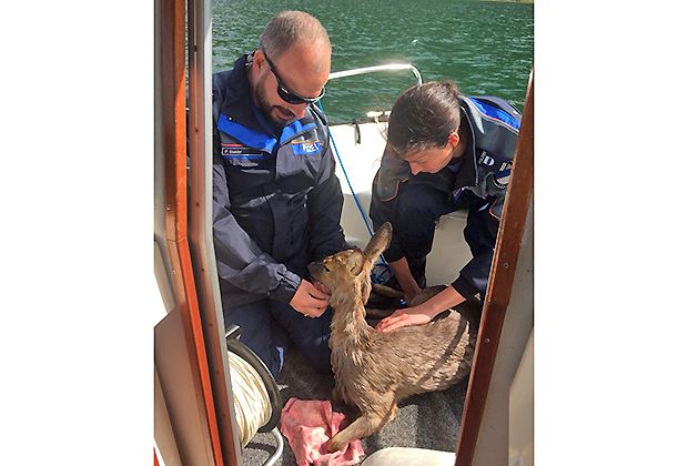 Die Seepolizei absolvierte auf dem Gewässer eine Einsatzübung. Ein Knabe machte die Polizisten darauf aufmerksam, dass sich ein Reh im See befindet. Dieses war weit weg vom Ufer.