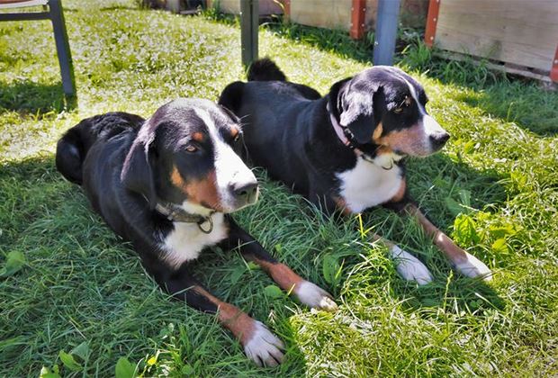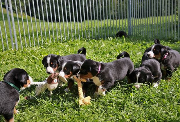 Die morgendliche Reise ins Appenzellerland ist an sich schon ein Abenteuer. Als mich die zwei Appenzeller Sennenhündinnen Xindi und Belina von weitem zuerst vorsichtig, dann warm empfangen, ist mein Tag damit schon gerettet. Es geht zum Brogershaus in Appenzell Schlatt. Da hausen in einer idyllisch gelegenen Region Monika und Stefan Fritsche, sowie die Hündinnen Xindi und Belina mit acht Welpen.