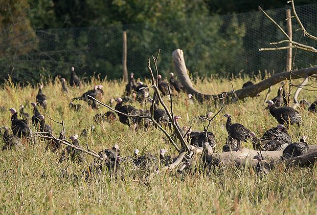 Bewusst halten die Vocks nicht die dort üblichen auf die Produktion von viel Brustfleisch gezüchteten weissen Trutenrassen, sondern die leichteren, schwarzen Rassen. "Sie sind näher bei der ursprünglichen Form und deshalb weniger krankheits- und verletzungsanfällig." Und das ist hier besonders wichtig, weil konsequent auf den Einsatz von Antibiotika verzichtet wird.