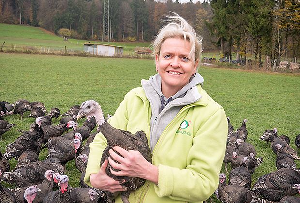 Esther Vock pflegt ein Vertrauensverhältnis zu ihren Truten. Die 800 Vögel haben täglich Auslauf auf eine grosse Weide. Die artgerechte Tierhaltung ist auf dem Betrieb in Niederwil AG seit Jahrzehnten Programm. --> Mit Video