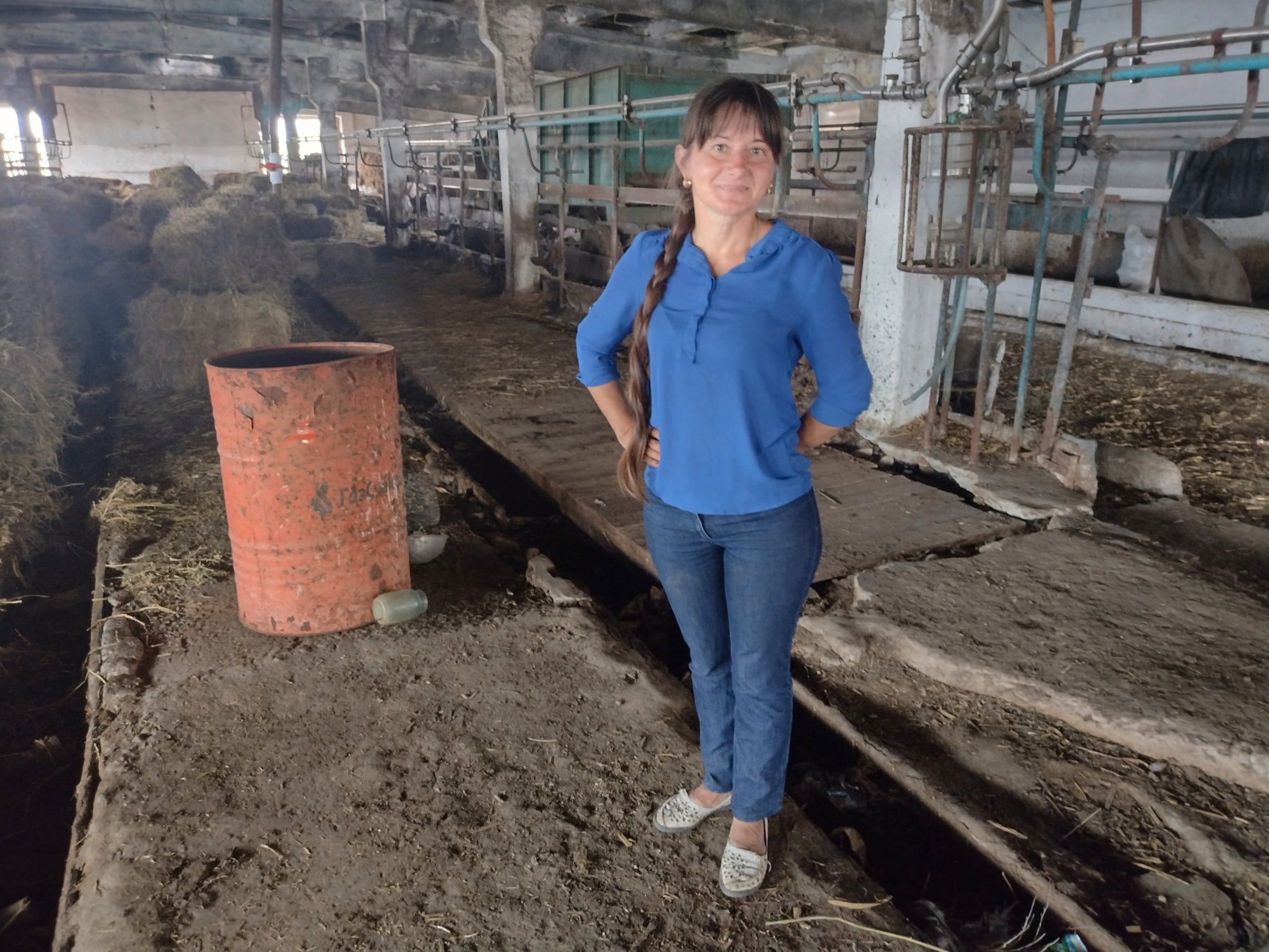 Eine ukrainische Landwirtin in einem Gebäude, wo einst die Kühe gemolken wurden. Zerstörte Infrastrukturen beeinträchtigen auch die Wasserversorgung.