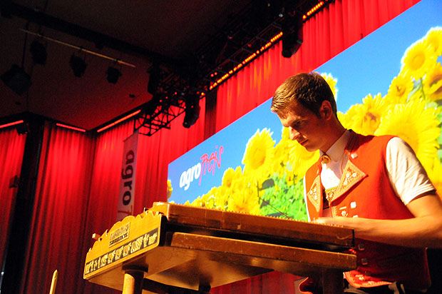 Punkt 16 Uhr hat der Agropreis 2013 seinen Anfang genommen. Eröffnet wurde der Anlass durch den bekannten Hackbrettspieler Nicolas Senn. "Er hat den Schweizer Popstar Bligg bekannt gemacht", erklärt Kassensturz-Moderator Ueli Schmezer, welcher durch den Abend führt.