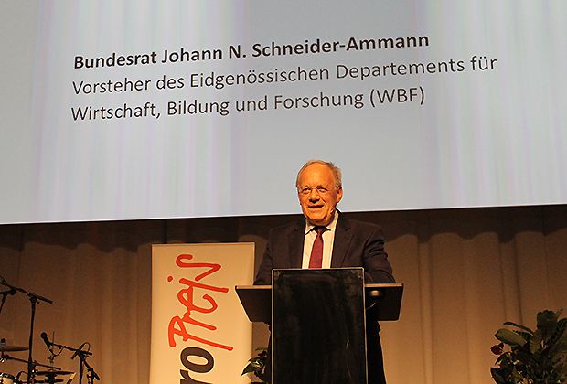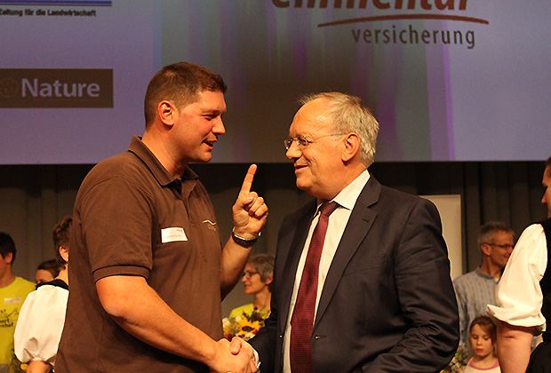 15.40 Uhr: Bundesrat Johann Schneider-Ammann ist auf der Bühne. „Ich freue mich hier zu sein. Dies vor allem auch deshalb, weil der Gastgeber aus dem Emmental stammt“, so der Agrarminister. „Vorurteile prägen unsere Gesellschaft. Auch die Landwirtschaft. Es ist aber nie zu spät, Vorurteile abzulegen“, so Schneider. „Der Preis soll aber die Leistungen und die Innovation der Landwirtschaft honorieren“, fuhr er fort. Die Landwirtschaft ist unternehmerisch und innovativ, betont der Bundesrat. „Schlau heisst, dass zu produzieren, was der Markt verlangt. Unsere Bauern haben immer wieder die Herausforderungen meistern können“, sagt Schneider. „Wir gratulieren heute nicht Ideen, sondern den Menschen, die hinter den Projekten stehen.“ Schneider gratuliert den Nominierten und hofft, dass sie sich am Markt durchsetzen. Denn ohne Innovation gäbe es keine Wettbewerbsfähigkeit, hält er fest. Aber nur diese ermögliche Arbeitsplätze. Der Agropreis sei die wichtigste Plattform der innovativen Landwirtschaft, rühmt der Agrarminister den Anlass. „Innovation hat aber zwei Gegner – Selbstzufriedenheit und Vorurteile“, so Bundesrat Schneider-Ammann. Das Gegenteil seien Unternehmertum und Neugier. Die Landwirtschaft sei eine Basistätigkeit, zu der man Sorge tragen müsse, so der Agrarminister. Aber jeden zweite Franken würde die Schweiz im Ausland verdienen, fährt er fort. Dem könne sich die Landwirtschaft nicht entziehen. Auf die am Mittwoch angekündigten Sparpläne des Bundes ging der Agrarminister nicht ein.