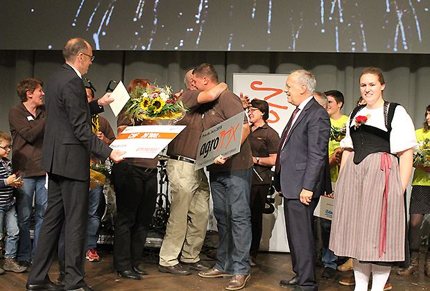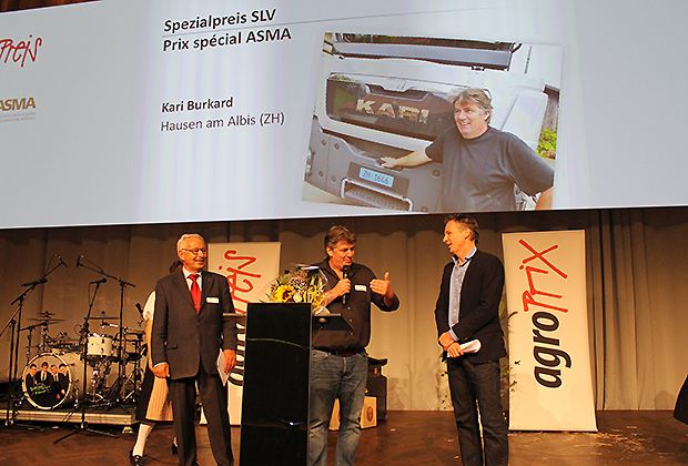 15.23 Uhr: Nun folgt der Spezialpreis des Schweizerischen Landmaschinenverbandes (SLV), dieser ist mit 5000 Franken dotiert. „Seit ich das Traktorfahren beherrsche, interessiert mich die Landtechnik“, so Schmezer. Bendicht Hauswirth vom SLV, prämiert die Entwicklungen der Landtechnik. „Diese stossen dem Ingenieur nicht sofort ins Auge, dem Praktiker schon). Die Entwicklungen sollen die Arbeiten erleichtern und optimieren sowie die Wirtschaftlichkeit erhöhen. Sieger ist „Kari Holzhacker“ von Kari Burkhard aus Hausen am Albis ZH. Aufgebaut auf einem MAN-LKW Chassis, erhöht es die Arbeitssicherheit des Arbeiters. Die Kabine ist höhenverstellbar, diese biete eine gute Übersicht, ermöglicht einen Schutz vor der Witterung, zudem ist sie schallisoliert. Das Nachrücken im Wald ist von der Kabine aus möglich. Das Siegerprojekt wird an der Agrama 2016 präsentiert. Burkhard erklärt, dass es lange gedauert habe, bis er die Maschine fertig gebaut habe. „Es dauert insgesamt 6 Jahre“, so der Zürcher. Das Trägergerat lasse sich aber auch für andere Zwecke verwenden, fährt er fort.