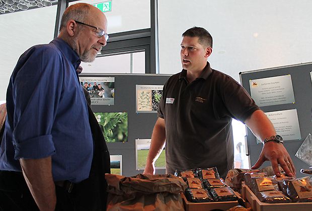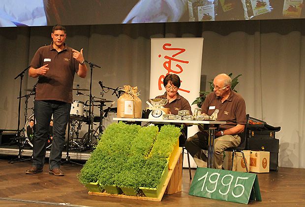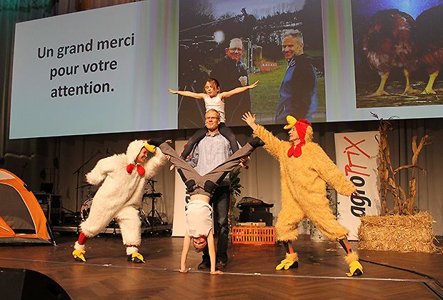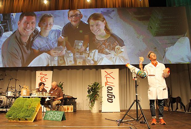 16.10 Uhr: Als nächstes Projekt darf die Familie Courtois aus Versoix GE auf die Bühne im Kursaal treten. Die Genfer haben zusammen mit Berufskollegen die Linsen wieder in die Schweiz gebracht. Mitte der 1990-er Jahre säte Michel Courtois das erste Mal Linsen aus. Dies deshalb, weil er wegen sinkenden Preisen nach Alternativen zu den Zuckerrüben und Weizen suchte. Zuerst verkauften sie die Linsen im Hofladen. Mit dem Platzieren der Linsen beim Detailhändler Manor schaffte es die Kultur aus der Nischenproduktion. Mittlerweile kultiviert die Familie Linsen auf einer Fläche von zwölf Hektaren. Der Ertrag liegt bei etwa bei insgesamt 15 Tonnen. Mit einer witzigen Show brachte Christophe Courtois das Publikum zum Lachen. Courtois erklärt den Erfolg der Linsen mit veränderten Essgewohnheiten. Pflanzliche und regionale Ernährung sei im Trend.