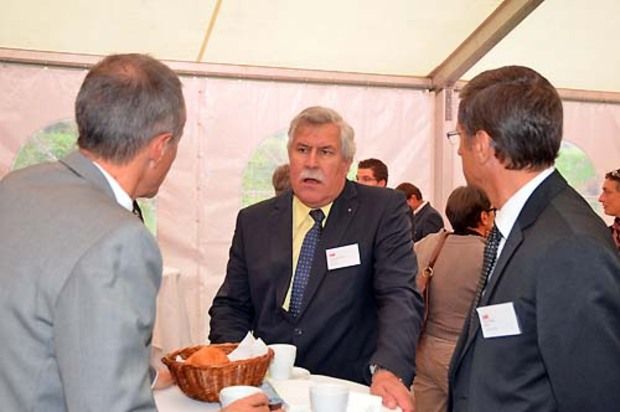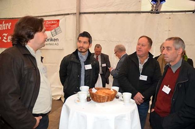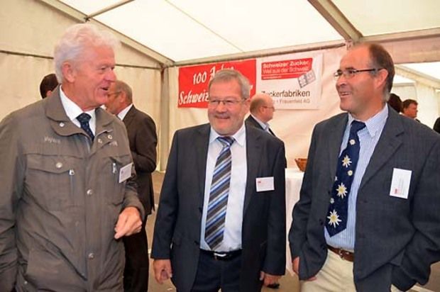 Heinz Schwab(v.l.), ehemaliger VR-Präsident Landwirtschaft AG der Zuckerraffinerie Aarberg (LAG), Guido Stäger, bis 2011 Direktor der ZAF und Samuel Keiser, Präsident des Schweizerischen Verbandes der Zuckerrübenpflanzer. -