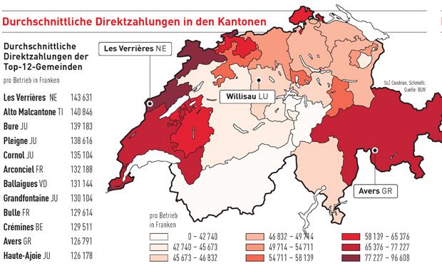Westschweizer Bauern erhalten 20 Prozent mehr als ihre Deutschschweizer Kollegen. Die Gemeinde mit den höchsten Zahlungen pro Hof – sie lagen im Jahr 2011 bei 143'631 Franken – ist Les Verrières im Kanton Neuenburg. Die Daten hat das Bundesamt für Landwirtschaft (BLW) im Auftrag der "Sonntagszeitung" errechnet. Von den zwölf Gemeinden mit den höchsten Zahlungen pro Bauernhof liegen neun in der französischen Schweiz, je eine im Tessin, im Berner Jura und in Graubünden. Zu berücksichtigen ist, dass die Betriebe mit den höchsten Direktzahlungen nicht diejenigen mit den grössten Einnahmen sind.