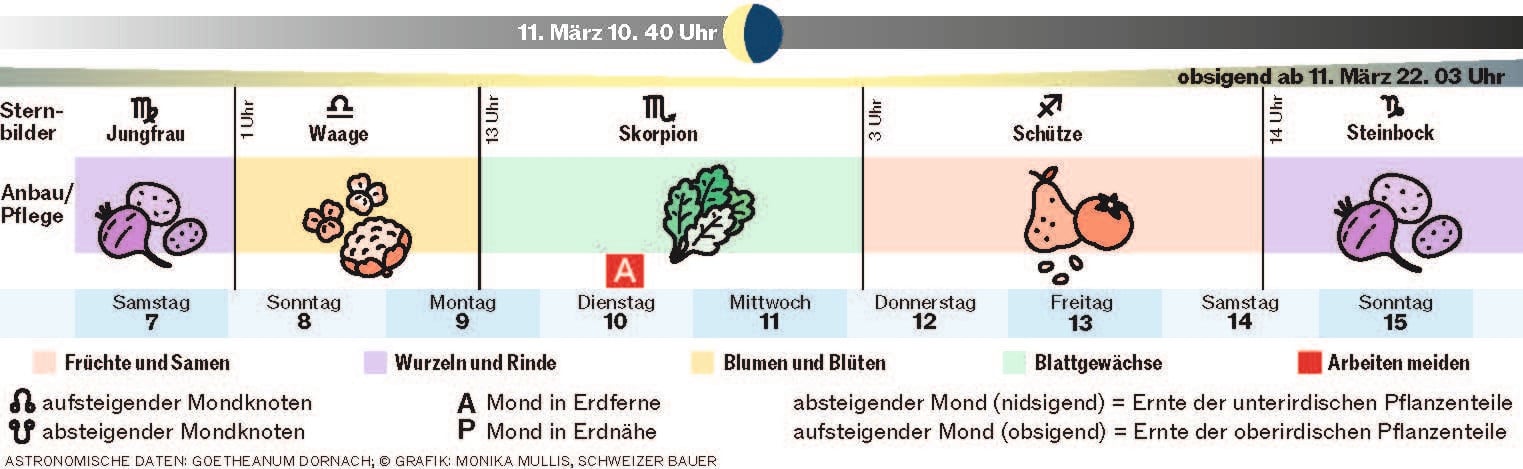 Die Erdferne am 10. März fällt laut dem Mondkalender des Goetheanums in Dornach SO auf einen Blatttag. Vorher, am Montag, 9. März, gibt es einen Blütentag. Dieser gilt laut den Beobachtungen von Maria Thun, die 2012 verstorben ist, als günstig für die Blumenpflege in Haus. Bei einem Versuch mit Radieschen stellte Maria Thun fest, dass die ausgesäten Pflanzen alle zwei bis drei Tage Unterschiede im Blatt- und Knollenwachstum aufwiesen. Der Mondkalender im «Schweizer Bauer» und auf schweizerbauer.ch bezieht sich auf ihre Beobachtungen.