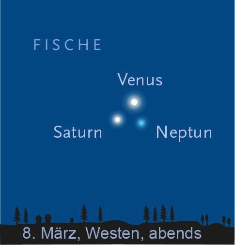 Nur alle 36 Jahre stehen Neptun und Saturn zusammen. Nun kommt Venus hinzu. Neptun allerdins ist von Auge nicht sichtbar.