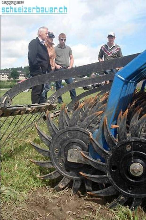 Fachsimpeln unter Berufskollegen war genau so wichtig wie die Fach-Referate. Hier im Bild der Rotor-Striegel mit Zinkensternen von der Firma Hatzenbichler. -