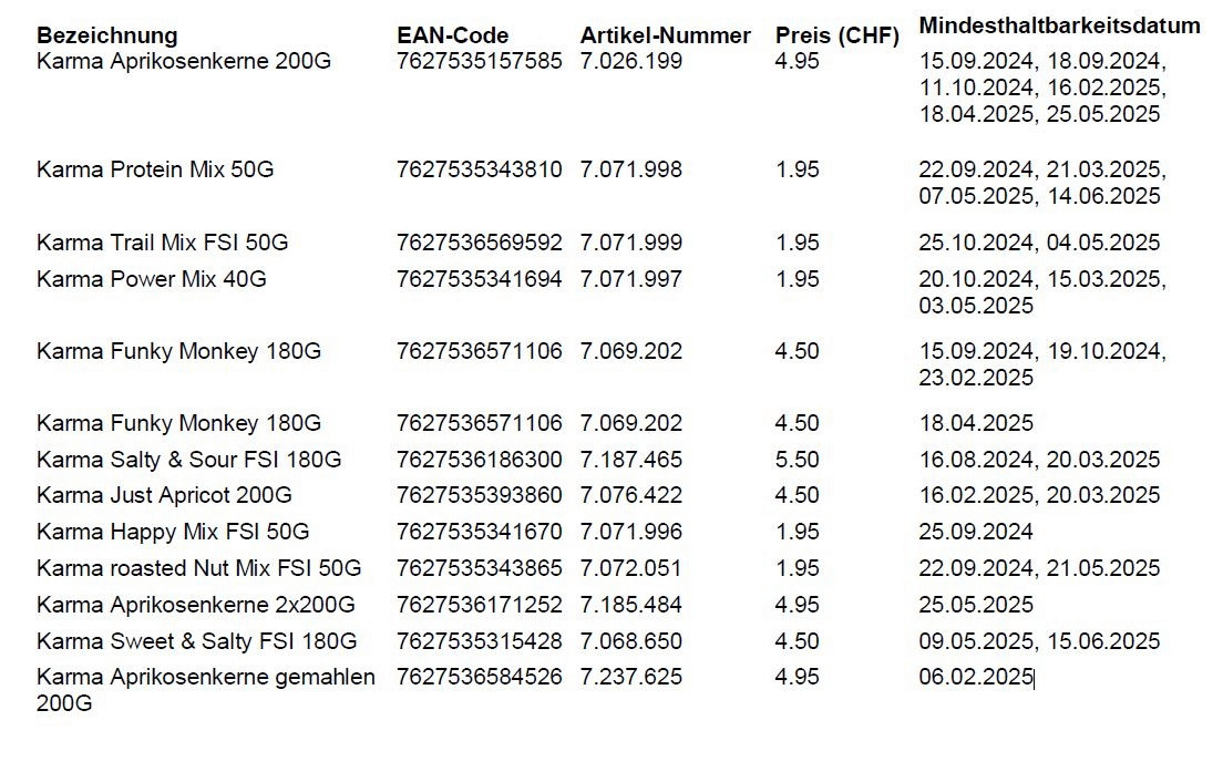 Coop ruft vorsorglich Karma Aprikosenkernen-Produkte zurück. Es besteht ein erhöhter Gehalt an Aflatoxinen und damit eine potenzielle Gesundheitsgefährdung.