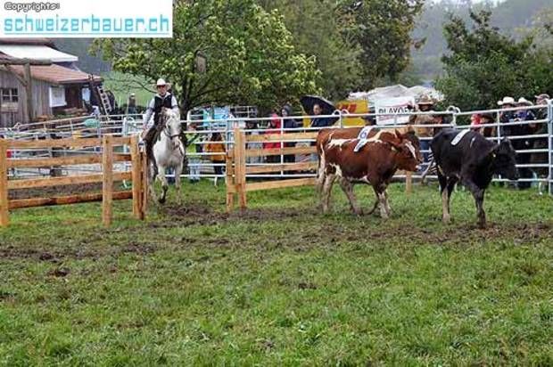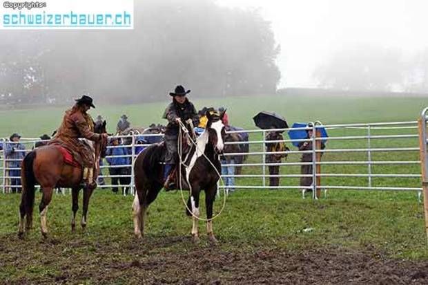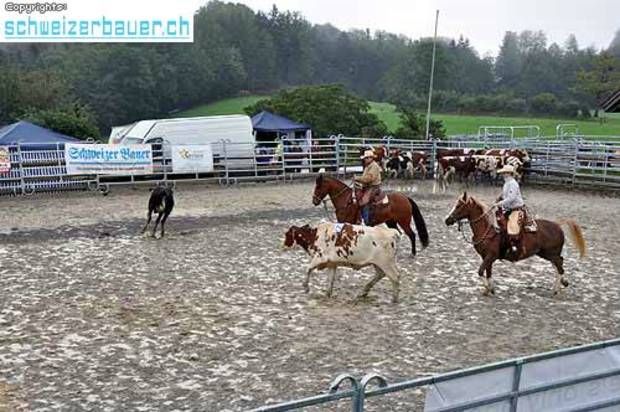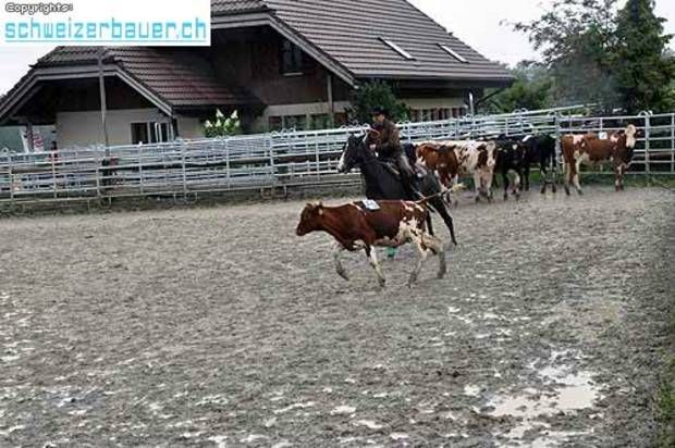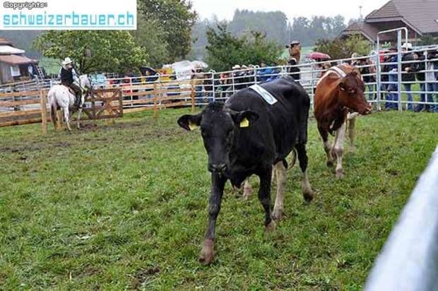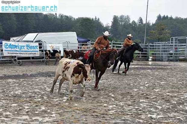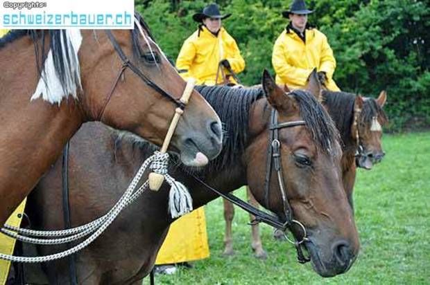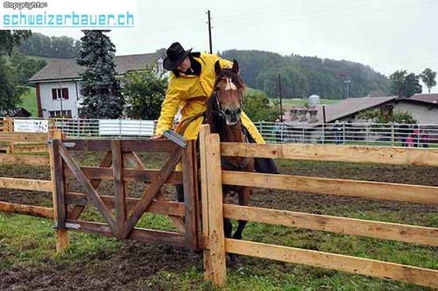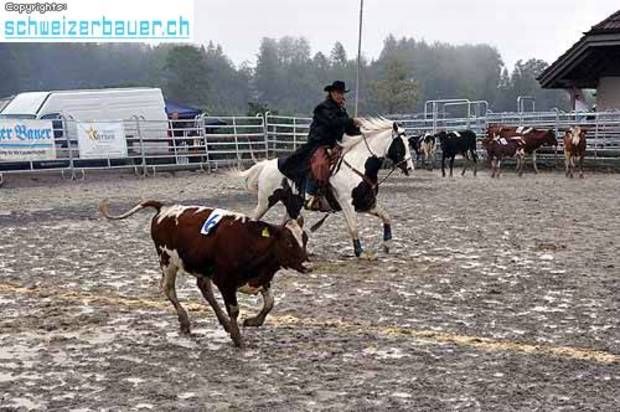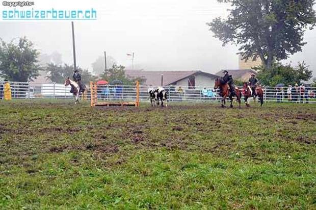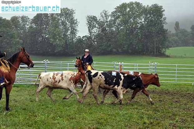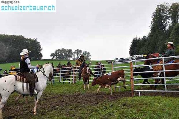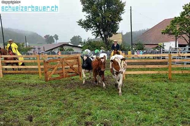 Am Cowhorse Day massen sich Cowboys und -girls in der Rinderarbeit. Ein faszinierendes Schauspiel für Gross und Klein. Der Dauerregen konnte dem 8. Working Cowhorse Day in Riggisberg nichts von seinem Charme nehmen. Bilder: Pamela Fehrenbach.