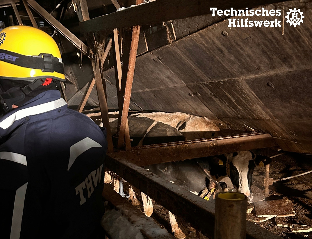 «Mit Rettungsgerätesatz, Kettensägen und viel Handarbeit drangen die Rettungskräfte zu eingeklemmten Tieren vor», teilte das Technische Hilfswerk (THW) von Bad Belzig und Luckenwalde auf Facebook mit. Ein Radlader war aufgrund seines Gewichts für den unterkellerten Stall zu schwer.
