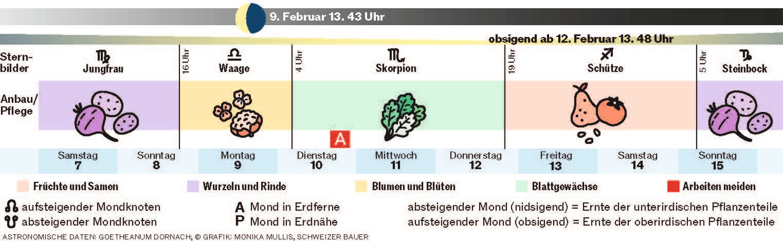 Der Mondkalender rät beim Mond in Erdferne von Aussaat oder Ernte ab. Saatgutkeimung respektive Lagerfähigkeit von Gemüse, Getreide und Obst könnten beeinträchtigt sein. Higegen wirkt der Mond in Erdnähe laut Demeter Schweiz verstärkend auf das Pilzwachstum. Wenn man dieses hemmen will, werden entsprechende Massnahmen unterstützt in Zeiten grösserer Entfernung des Mondes von der Erde.