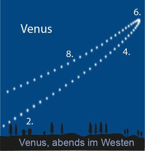 Anfang Januar lief Venus hinter der Sonne entlang und jetzt hat sie sich so weit von deren Glanz befreit, dass man den hellen Planeten am Abendhimmel wieder sehen kann. Tag für Tag hebt sich der Abendstern höher und erreicht dann am Sommeranfang seinen höchsten Stand. So spiegelt dieses Jahr Venus den Aufstieg der Sonne. So wie das Zentralgestirn täglich höhere Bögen zieht, so erscheint am Abend Venus höher und höher über der Landschaft und bestimmt mit ihrem enormen Glanz den Abendhimmel.