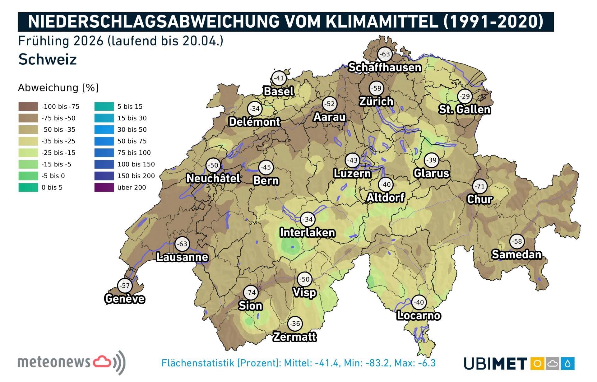 An zahlreichen Messstandorten kamen in den ersten dreieinhalb Wochen des Monats nicht einmal 10 Millimeter Niederschlag zusammen. Normal wären im Mittelland für den gesamten April rund 70 bis 100 Millimeter, auf der Alpensüdseite zwischen 100 und 200 Millimeter. Flächendeckenden Niederschlag gab es demnach einzig am 12. und 13. April. An vier weiteren Tagen fielen nur regional begrenzte Niederschläge.