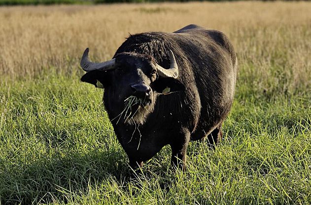 18 ausgebüxte Wasserbüffel haben Garten und Pool eines Paares in Grossbritannien verwüstet. Das Paar entdeckte die jeweils 600 Kilogramm schweren Tiere am Morgen.