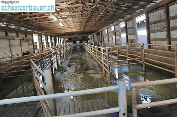 Statt eines Schiebers werden die Laufgänge mit "Güllenwasser" geschwemmt und somit gereinigt.