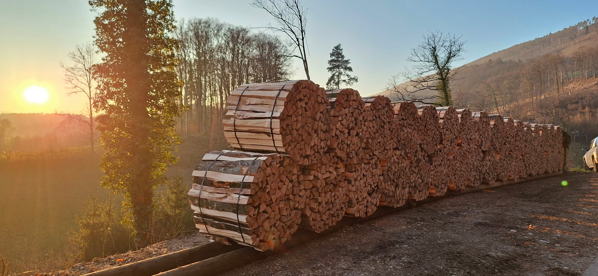 Beim Holzen mit dem Lindner Geotrac mit Abendstimmung.