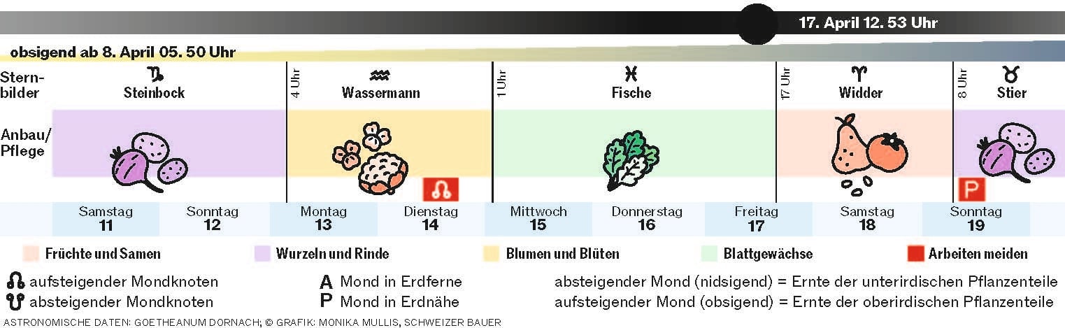 Nach dem Frost vor zwei und Ostern vor einer Woche hat die Sä- und Pflanzzeit endgültig begonnen. Für alle, die sich dabei nach dem Mond richten, heisst das: am Montag und Dienstag gibt es zwei Blütentage. Diese sind günstig für die Aussaat und Pflege von Blütenpflanzen, die dann besonders üppig blühen sollen – wobei die kurze Zeit des aufsteigenden Mondknotens gemieden werden sollte.