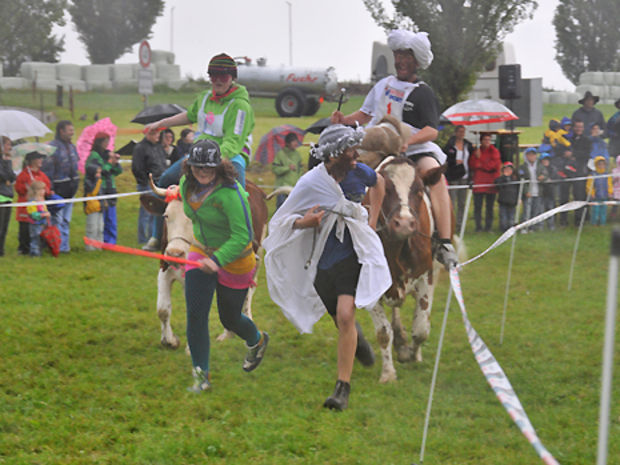 Totz unglaublichem Regenwetter haben zwölf verkleidete Teams um den Sieg gekämpft, angefeuert von vielen mit Regenschirmen bewehrten Zuschauern aus Stadt und Land. Ebenfalls Tradition scheint es zu sein, dass es am Kuhrennen-Wochenende regnet. Schon hie und da war die neue Bauernregel zu hören: «Fällt die Heuet auf den Kuhrennfreitag – verschiebe auf die nächste Woche».1. Rang: Hose- Lupf (Simon Jost 13, Köniz und Dominik Rolli 15, Oberbalm)
