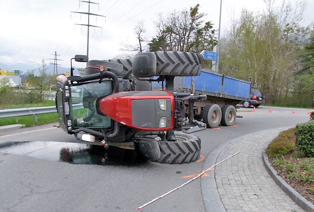 Ein 26-Jähriger fuhr kurz nach 17 Uhr mit Traktor und Anhänger von Chur nach Jenins GR. In einem Kreisel nahe Malans verpasste der Lenker die Ausfahrt. Es musste deshalb den Kreisel noch einmal passieren. Aus noch ungeklärten Gründen kippte der Traktor um, der mit Aushubmaterial beladene Anhänger hingegen blieb unbehelligt. Gemäss der Kantonspolizei Graubünden verkeilte sich die Anhängerkupplung, dass die Bergung der 25 Tonnen schweren Komposition erheblich erschwerte.