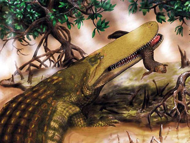 Der älteste bekannte Vorfahre der heutigen Krokodile in Afrika war wahrscheinlich über neun Meter lang, fing Fische und hatte einen merkwürdigen Schild auf dem Kopf. Das berichten US-amerikanische Forscher im Online-Fachjournal «PLoS One».