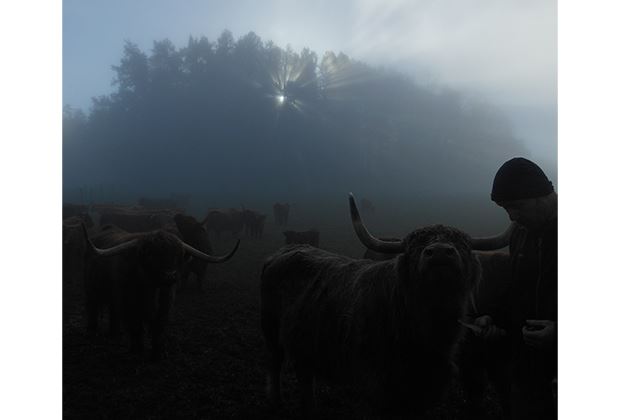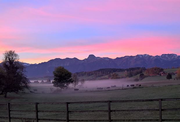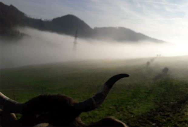 "Dieses Bild wurde anlässlich eines SchuB-Morgen, Ende Oktober, von der Lehrerin gemacht.Es zeigt einen Teil unsere Hochlandrinderherde beim Sonnenaufgang im nebligen Embrach im Zürcher Unterland. „Goldi“, die Kuh im Vordergrund, hebt den Kopf um von mir (Zipfelkappe) gestriegelt zu werden" schrieb David Eggimann zu seiner Einsendung.