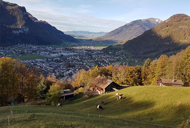Herbstweide in Uebeschi BE vor Eiger, Mönch und Jungfrau.