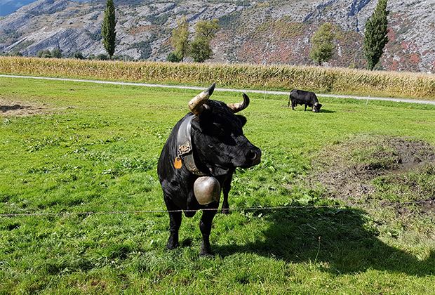 Die schönen Eringerkühe geniessen die Herbstweidein Turtmann VS.