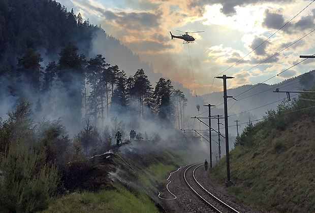 Zusätzlich wurden die Löscharbeiten mit zwei Helikoptern unterstützt. Gegen 21 Uhr war der Brand grösstenteils gelöscht. Eine Brandwache war über Nacht vor Ort. Nach ersten Ermittlungen ist die Brandursache auf einen Kurzschluss zurückzuführen. Das Personenschutzgitter eines Fahrleitungsmastes wurde aus seiner Verankerung gerissen. Durch den Kontakt mit dem Mast entstand ein Kurzschluss, der Wiesland, Gebüsche und Bäume in Brand setzte.
