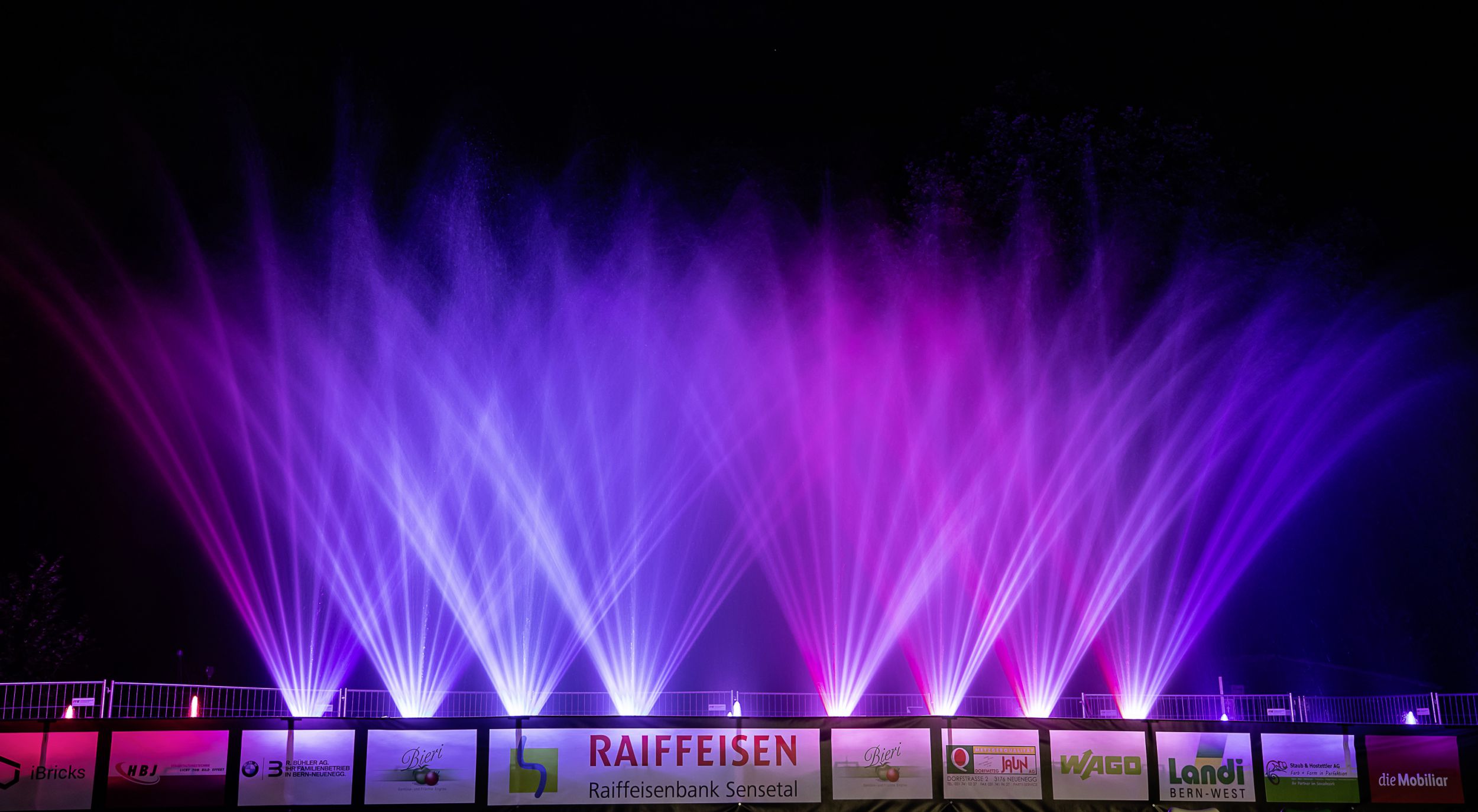 Entstanden ist der Wasserzauber als privates Projekt in einem Neuenegger Quartier. Mittlerweile gibt es einen Verein, der sich um das Spektakel kümmert. Es findet an mehreren Abenden, darunter auch am 1. August, auf dem Viehmarktplatz statt.