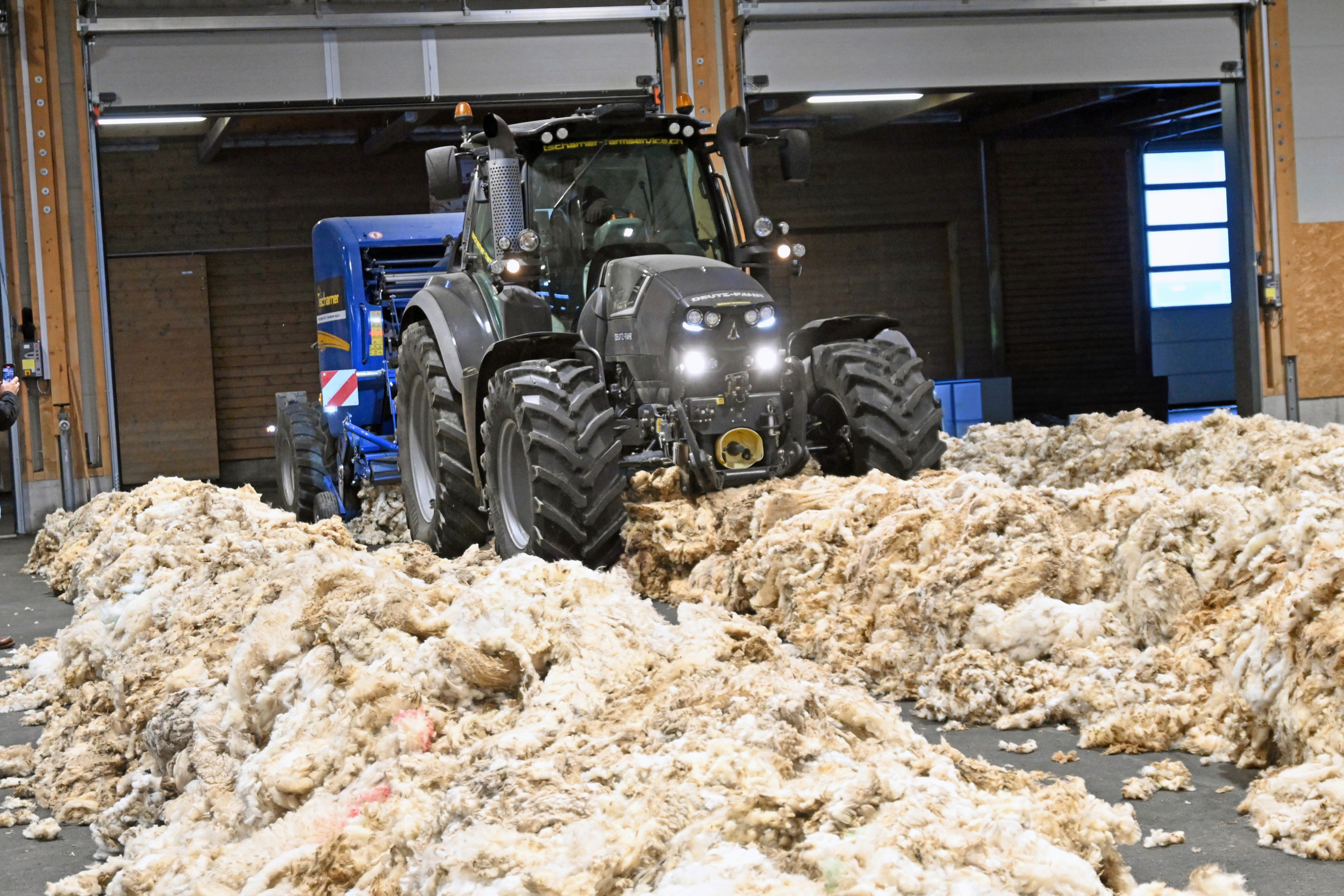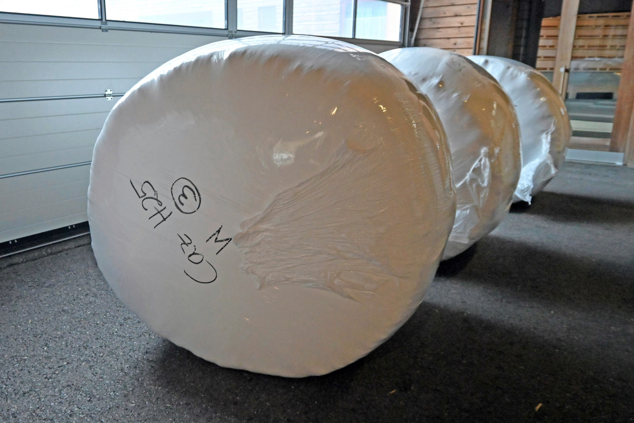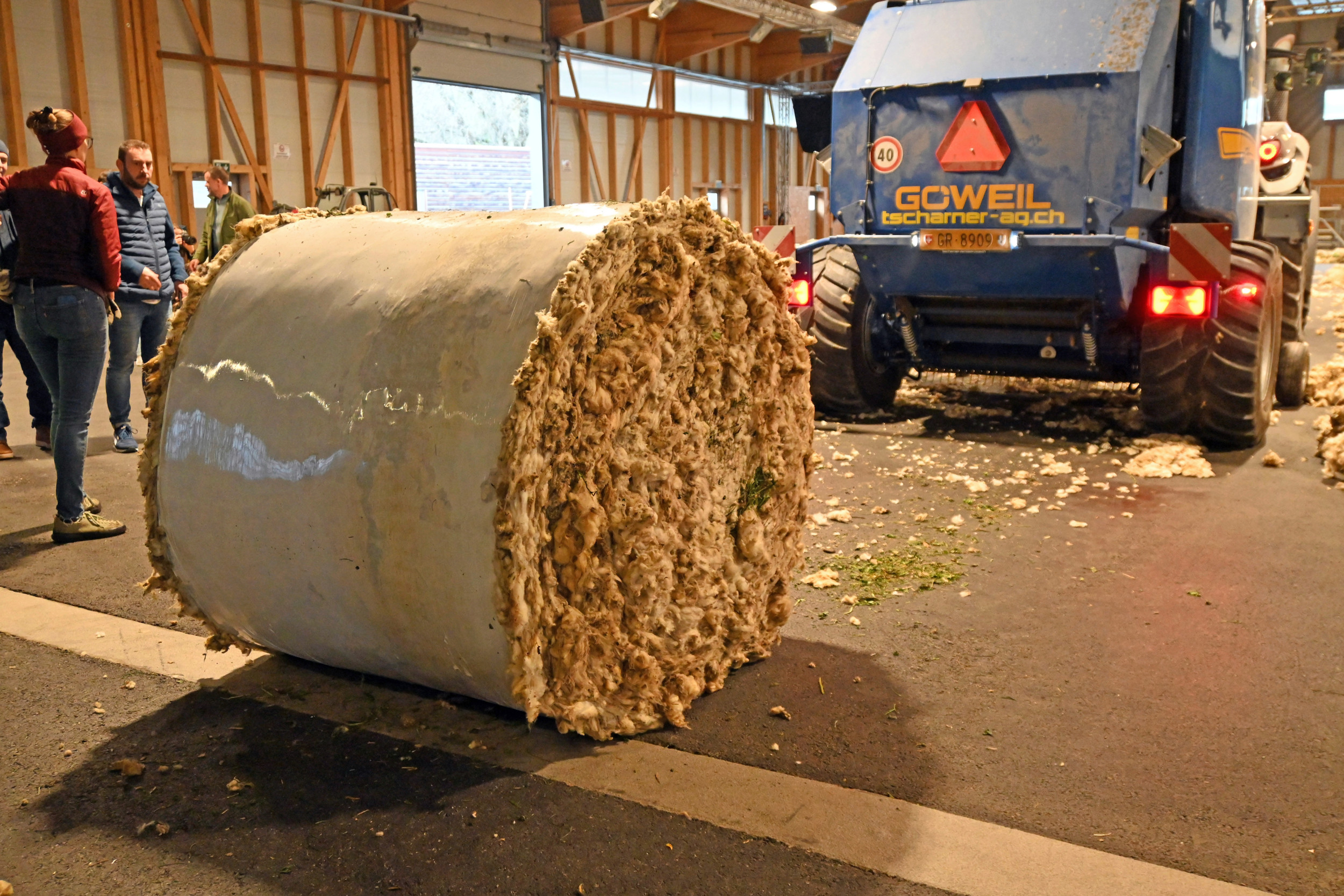 Wenn die Wollschlange ihre maximale Länge erreicht hat, fährt ein Traktor mit einer Rundballenpresse in die Halle und presst die Wolle zu Rundballen. Diese werden wie Siloballen mit Silofolie luftdicht gewickelt. Eine Balle wiegt etwa 330 Kilogramm. «Da Wolle ein tierisches Nebenprodukt ist, fällt sie in dieselbe Kategorie wie Schlachtabfälle», erklärt Friedrich Baur. Für diese Nebenprodukte gelten strenge Richtlinien, auch im Transport.