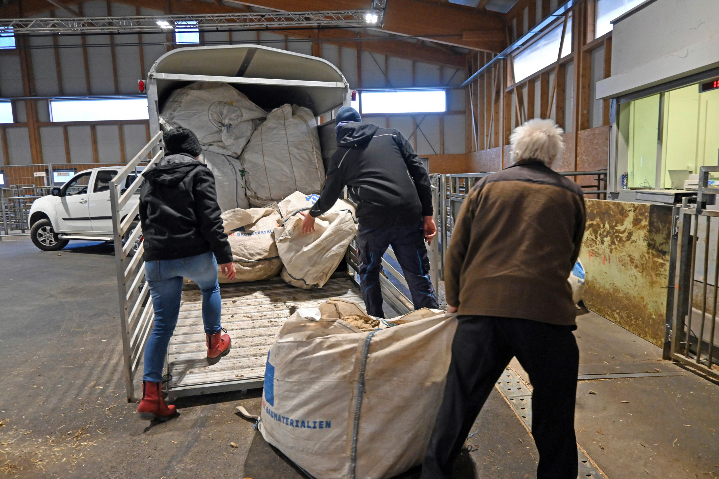 Grosse, lange Wollhaufen liegen in der Bündner Arena in Cazis im Kanton Graubünden. Zwei Linien weisse Wolle und eine Linie braune und gemischte Wolle. Mit den unterschiedlichsten Fahrzeugen stehen Bauern und Bäuerinnen aus der Region in der Schlange, um ihre Wolle an die Wollannahme von Swisswool zu bringen.