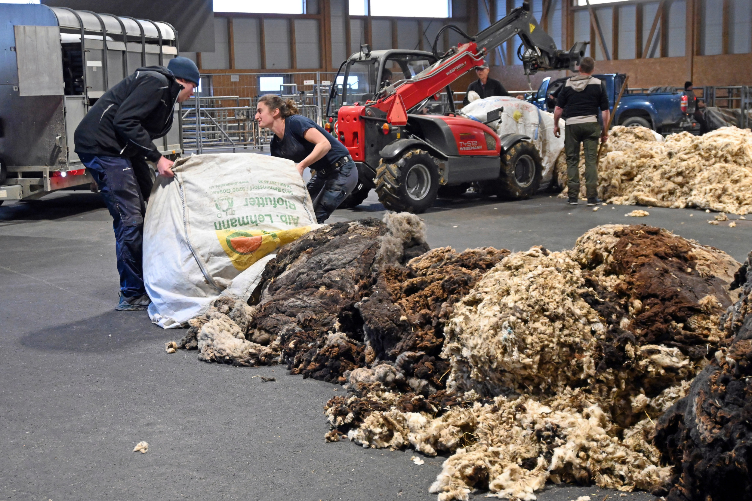 Nach dem Wägen bringt ein Teleskoplader den Bigbag zum entsprechenden Haufen. Braun und gemischt oder weiss. Zwei Mitarbeiter der Sammelstelle leeren den Sack von Hand aus. Ein weiterer Mitarbeiter bringt die Wolle mit einer Heugabel in die Schlangenform. Mehrere Leute sammeln direkt Wollstücke mit Markierfarbe heraus. Die Farbe vom Markieren der Schafe geht beim Waschen fast nicht heraus.