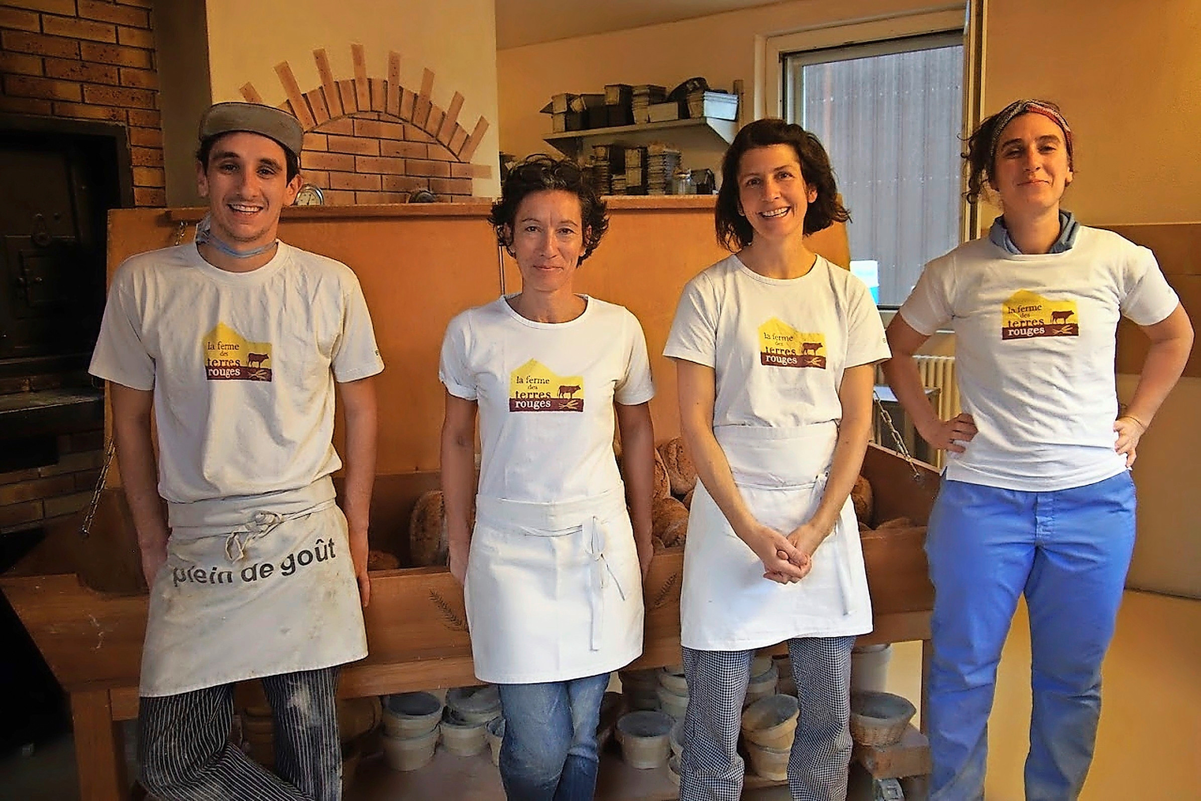 Caroline Thubert (2. v. l.) mit der Bäckereiequipe der Ferme des Terres Rouges vor dem Holzofen der Hofbäckerei.