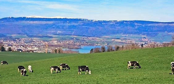 Ausblick der Kühe des Betriebes auf Yverdon-les-Bains VD.