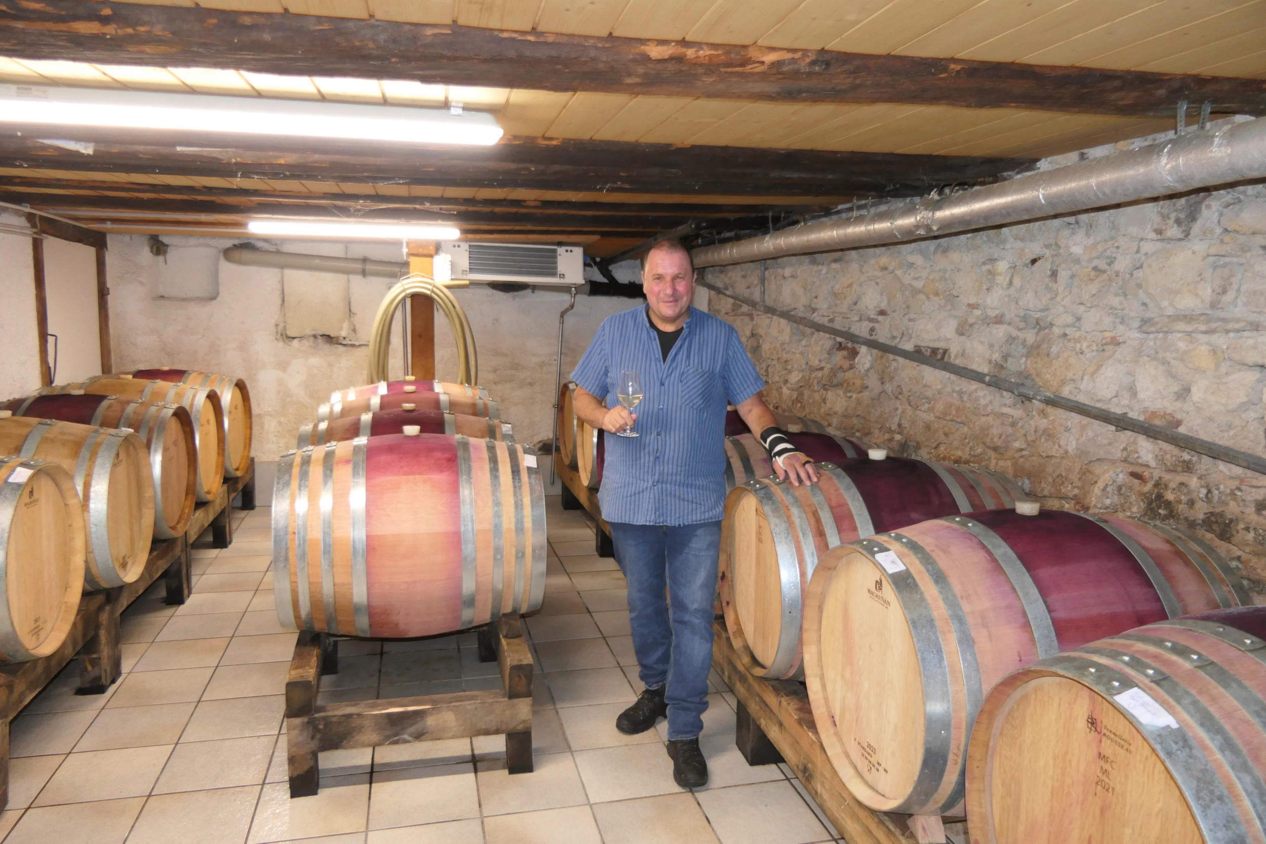 Gastgeber Ambros Thüring in seinem Weinkeller in Ettingen.