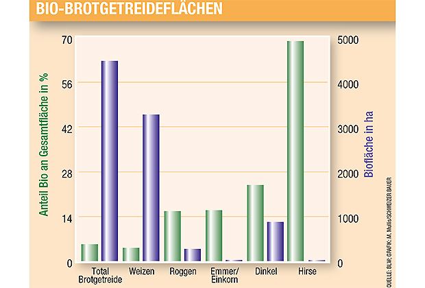 Weizen ist mit 3284 Hektaren das am häufigsten biologisch angebaute Brotgetreide. Auf Rang zwei und drei liegen Dinkel und Roggen. Betrachtet man jedoch den Bioanteil an der Gesamtfläche der jeweiligen Getreidearten zeigt sich ein anderes Bild: Den weitaus höchsten Bioanteil weist die Hirse auf. 69% der Hirseflächen in der Schweiz werden biologisch bewirtschaftet. Beim Dinkel sind es knapp 24%, beim Einkorn 16%. Weizen hat lediglich einen Bioanteil von 4,2% an der gesamten Weizenfläche.