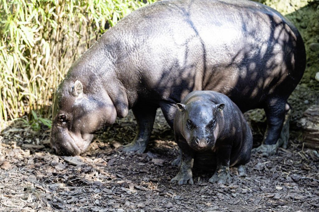 Das Zwergflusspferd-Baby Sala ist zwar schon über ein halbes Jahr alt, aber es wartete die ersten warmen Tage ab, um sich nun mit der Mutter im Aussengehege des Basler Zollis zu zeigen. Der Nachwuchs sei putzmunter und gefrässig, teilte der Zoo Basel am Mittwoch mit.