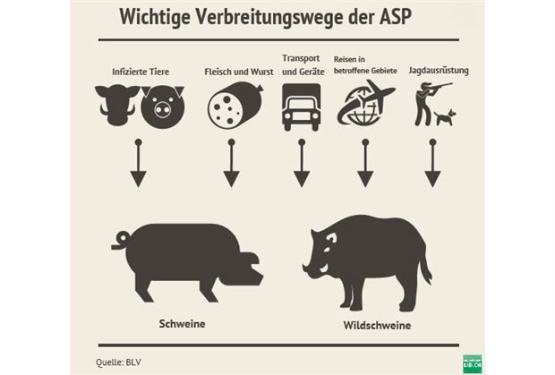 Sprünge der Seuche über grössere Distanzen – wie von Osteuropa nach Belgien oder von Ostpolen nach Westpolen – zeigen, dass das Risiko einer Einschleppung durch Menschen erheblich ist. Besonders über Fleischabfälle mit Erregern breitet sich das Virus über weite Distanzen aus. Ein achtlos weggeworfenes Sandwich an einer Autobahnraststätte kann daher erhebliche Folgen haben. Geraten nämlich Wildschweine mit solchen Abfällen in Kontakt, können sie sich infizieren. Laut BLV erfolgt im Gegensatz dazu die Ausbreitung durch Wildschweine nur langsam und über kurze Distanzen.
