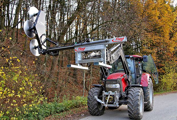 Bäume und Hecken schneiden ist in der Regel eine zeitaufwendige und kräfteraubende Aufgabe. Strassen- und Wegränder per Hand von herabhängenden Ästen zu befreien, ist nicht ganz einfach, gefährlich und Schnitt für Schnitt eine Sisyphusarbeit. Der deutsche Hersteller Fliegl bringt nun eine neue Astsäge auf den Markt, die schnell und einfach per Euronorm-Aufnahme an Front-, Rad- oder Teleskoplader angebaut werden kann. Erforderlich ist lediglich ein doppelt wirkender Anschluss. Entwickelt und gebaut hat die Astsäge das Agro-Center von Fliegl am Standort in Kastl (siehe Kasten).