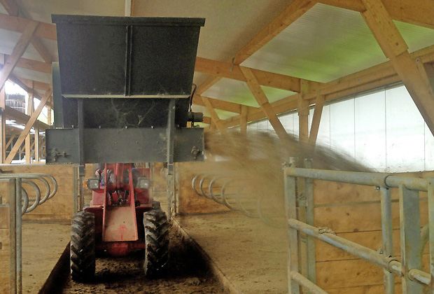 In diese streut er Strohpellets ein. Dazu hat er eine Schaufel für den Frontlader derart abgeändert, dass sie zum Einstreuen gebraucht werden kann. Viermal jährlich fährt er damit den Boxen entlang und füllt Strohpellets nach. Fürst erklärt: «Ich befülle den Streuer direkt aus dem Big Bag. Durch das schnell laufende Förderband fliegen die Pellets in den Kopfbereich der Boxen. Von dort schieben die Muni sie am Anfang selber nach hinten, später, wenn der Vorrat schwindet, mache ich das.»