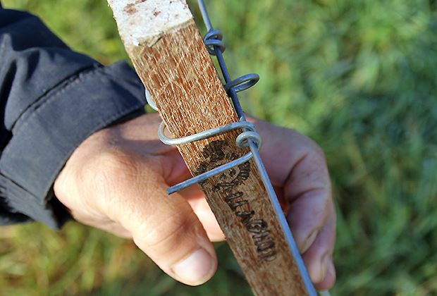 Die Zwischenpfähle wurden nur zum Teil in den Boden geschlagen, damit sie sich vom Boden abheben lassen. «So kann ich darunter mähen», sieht der Landwirt als grossen Vorteil. Eine zweite Person muss während des Mähens das Zwischenholz anheben. Die Zwischenpfähle sindaus hartem Tropenholz, Insultimber genannt. Dieses leitet den Strom nicht, so dass keine Isolatoren nötig sind.