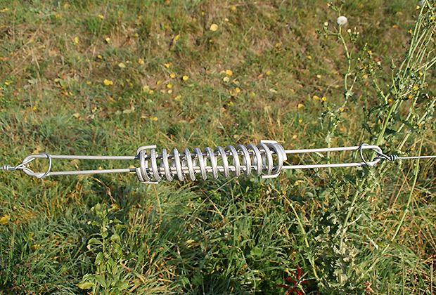 Zwischen den Eckpfählen wurden dicke Drähte gespannt und anschliessend in den Zwischenräumen Hölzer an den Drähten angebracht, um ihnen zusätzlich Halt zu geben. Stahlfedern sorgen für einen gleichbleibenden Zug des Drahtes bei verschiedenen Temperaturen.